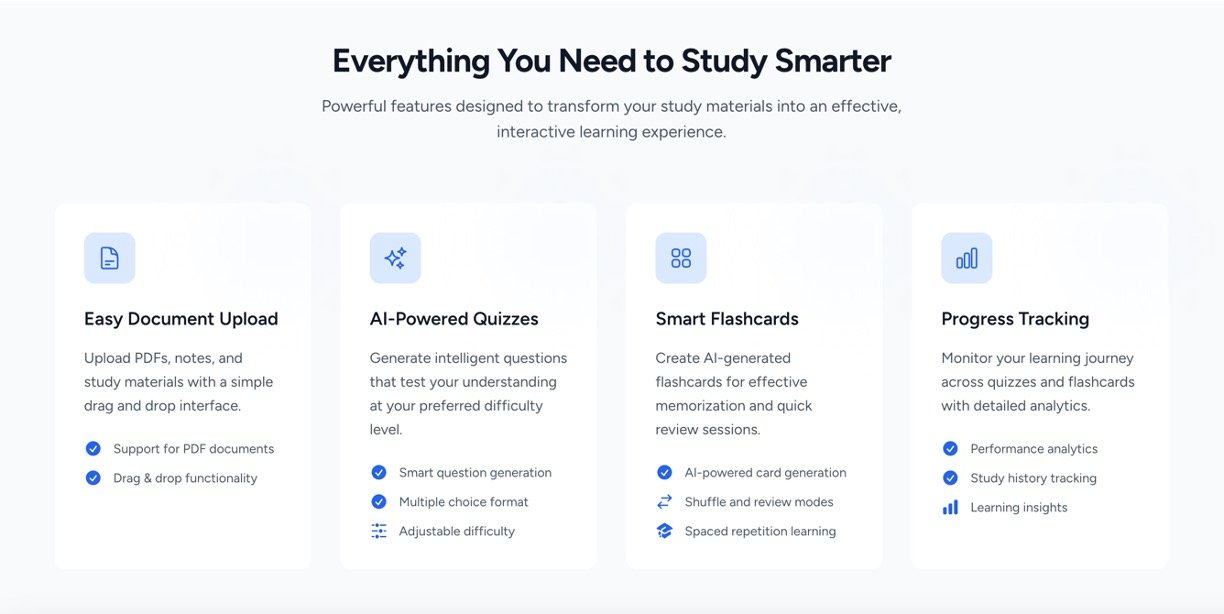 Easy Material Upload: Supports PDFs and notes with drag-and-drop functionality for quick study setup.