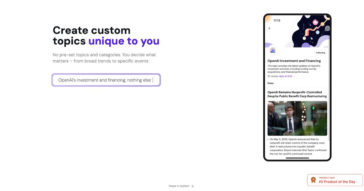 • Stay up to date on niche interests, hobbies, or professional topics without sifting through irrelevant news.