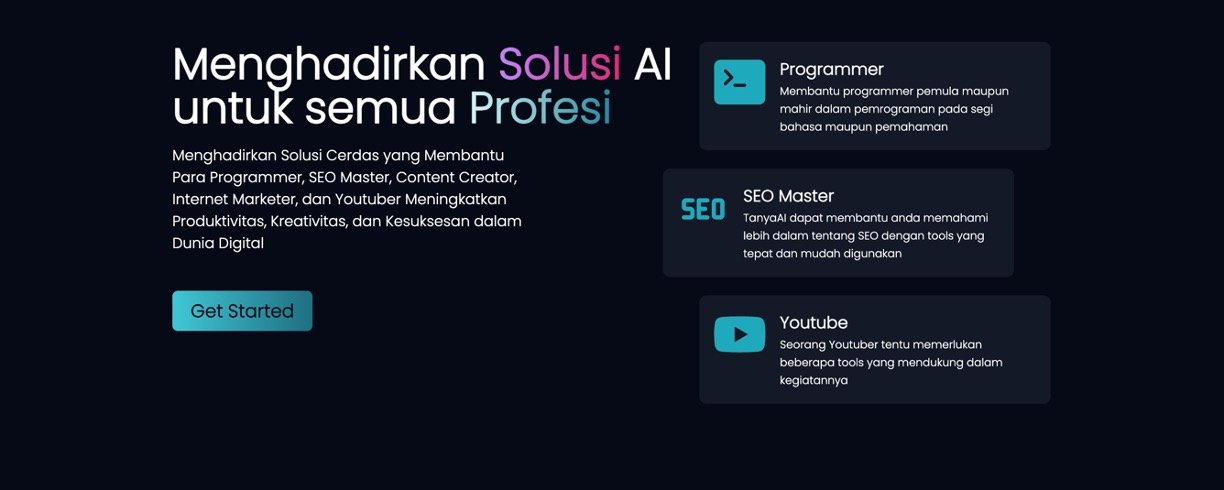 TanyaAI stands as Indonesia's top AI assistant, powered by cutting-edge technology to deeply understand and solve your problems effortlessly. Tailored for digital pros like programmers, SEO experts, content creators, internet marketers, and YouTubers, it boosts your productivity and creativity in the online world. Whether you're a beginner or pro, this simple platform delivers smart, customized help right when you need it.