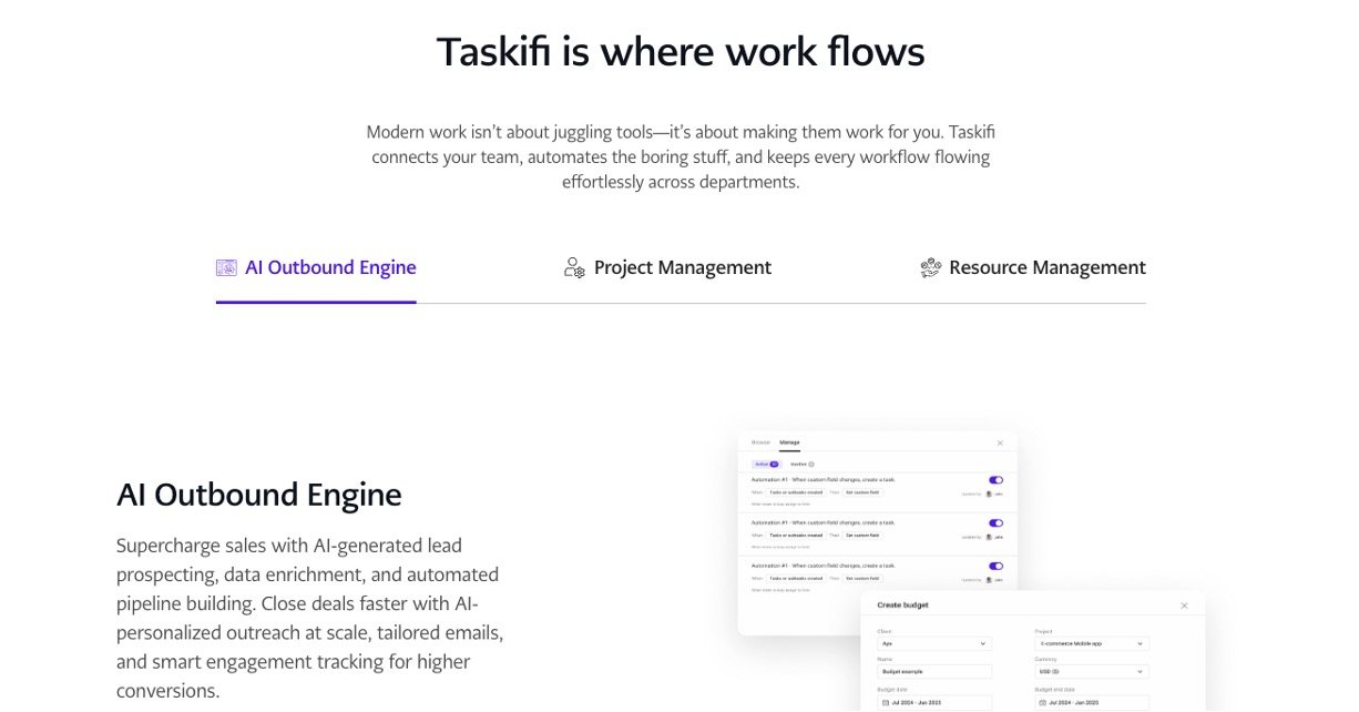Taskifi is an AI-powered intelligent sales and work management platform designed to unify teams, automate workflows, and enhance productivity across businesses. It integrates AI for smart lead generation, personalized outreach, and resource management, helping sales teams close deals faster and keeping projects on track with AI-driven budgeting and planning. Taskifi also supports seamless integration with popular apps like Google Docs, Microsoft products, and Slack to maintain smooth collaboration and workflow continuity.