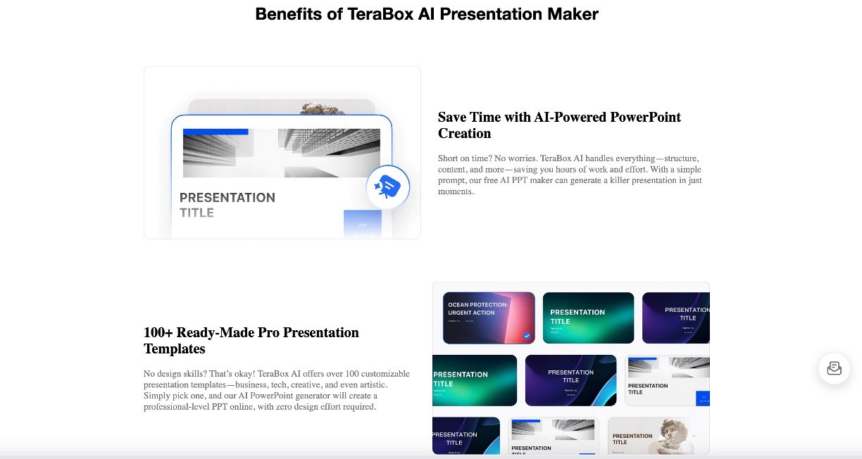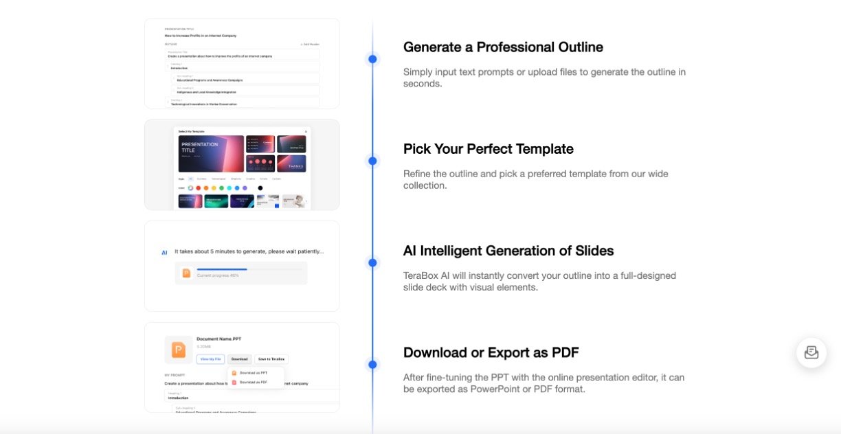 TeraBox AI Presentation Maker is a powerful AI-driven tool designed to create professional, visually engaging slide decks in seconds. Users can generate presentations from simple text prompts, pasted notes, or uploaded documents and PDFs. The AI analyzes input content to produce a logically organized outline and fully formatted slides with appropriate charts, images, icons, and graphics. It supports up to 40 slides per presentation and multiple languages, making it useful for diverse audiences from students to business professionals. Presentations can be edited after creation and saved directly to TeraBox cloud storage for easy access and sharing.