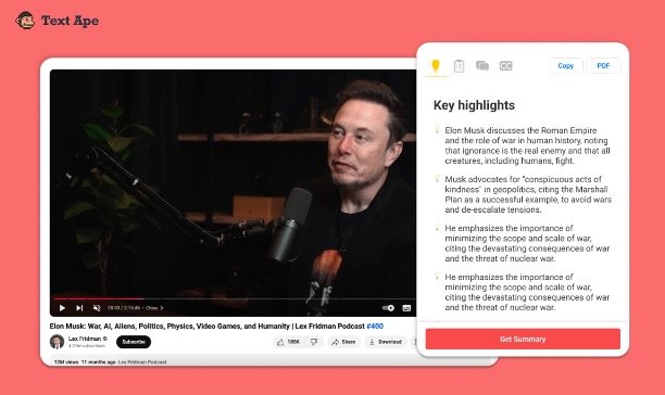 Text Ape is a user-friendly Chrome extension that transforms the way you interact with YouTube videos. Powered by advanced AI models, it delivers concise video summaries, full transcripts with timestamps, and key insights—right beside your video. Whether you're a student, researcher, or professional, Text Ape helps you save time by letting you quickly grasp the main points of any video, search for exact quotes, and jump straight to the moments that matter. With seamless sharing and export options, Text Ape streamlines content research, learning, and productivity for everyone—even if you’re not tech-savvy.