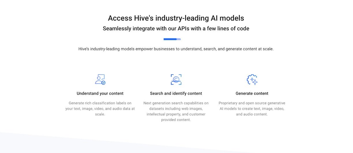Hive AI is your go-to cloud platform for smart AI tools that understand, search, and create text, images, videos, and audio effortlessly. Trusted by big companies worldwide, it powers everything from spotting fake content to generating cool visuals—all through simple APIs anyone can use. No tech headaches; just upload, analyze, or create with reliable results that keep your online world safe and creative.