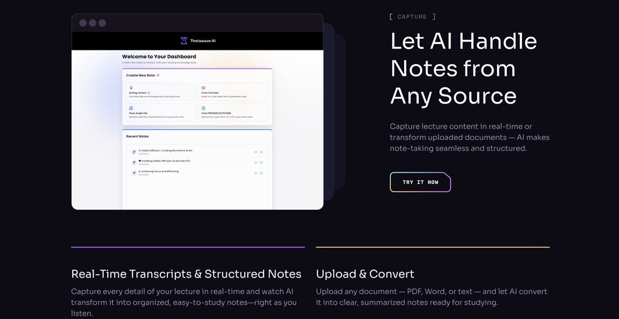 ThetaWave AI is the ultimate note-taker for college students, capturing lectures in real-time and transforming audio, text, files, or YouTube videos into beautifully organized notes, quizzes, flashcards, and more. It handles everything from PDFs to live classes, saving you hours of manual work so you can focus on understanding and acing exams. Trusted by students worldwide, it's your all-in-one study buddy that makes tough subjects enjoyable and easy to master.