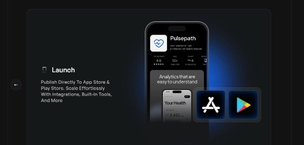 • One-click builds and publishing to App Store/Play Store, with push notifications, analytics, and OTA updates included.
