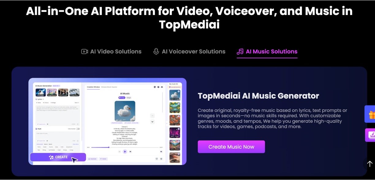 All-in-One AI Hub for Videos, Voiceovers, and Music.