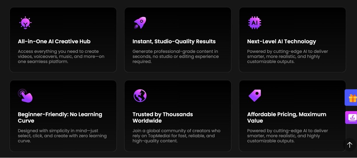 TopMediai is a comprehensive AI-driven creative platform that empowers users to generate dynamic videos, realistic voiceovers, and original music quickly and easily. With no prior experience required, it offers a seamless experience for content creators, marketers, educators, and entertainers who want to produce professional-grade media. Its suite of tools includes AI video generation with transitions, customizable voice cloning, text-to-speech in 190+ languages, AI music composition, and AI song covers. TopMediai also provides APIs for developers to integrate these powerful AI capabilities into applications, making it a versatile solution for all creative needs.