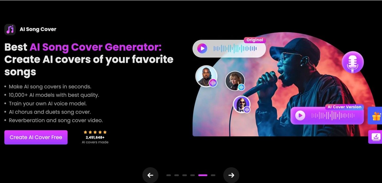 • AI Music Generator and AI Song Cover tools to create royalty-free custom music and vocal covers effortlessly.
