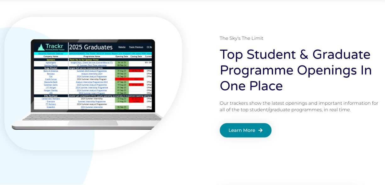 Trackr (formerly Bristol Tracker) is a trusted platform designed to help undergraduate students find internships and job opportunities efficiently. It offers comprehensive, continuously updated application trackers in the form of user-friendly web-based spreadsheets that aggregate internship and graduate program openings, often capturing new listings before employers widely promote them. The platform facilitates millions of job applications for employers and provides a vibrant community with active group chats for support, networking, and sharing advice. Unlike traditional job boards, Trackr does not charge companies to list positions, ensuring students have access to the widest range of opportunities. Premium members benefit from exclusive alerts and increased chances of securing job offers.