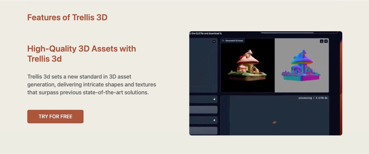 Trellis 3D is a cutting-edge AI tool from Microsoft that lets you create super-detailed 3D objects just by typing a description or uploading a picture. It uses smart tech called Structured LATent (SLAT) to make realistic shapes and textures that look amazing, and you can turn them into different 3D files ready for games or designs. No fancy skills needed – it's perfect for anyone dreaming up 3D ideas without the hassle of traditional modeling.