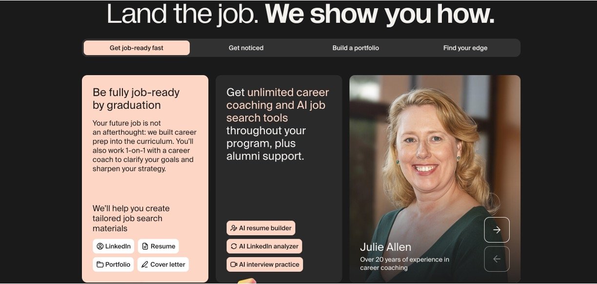 Hands-on projects for real companies, building a portfolio employers want, plus career coaching and direct resume sends to partners.