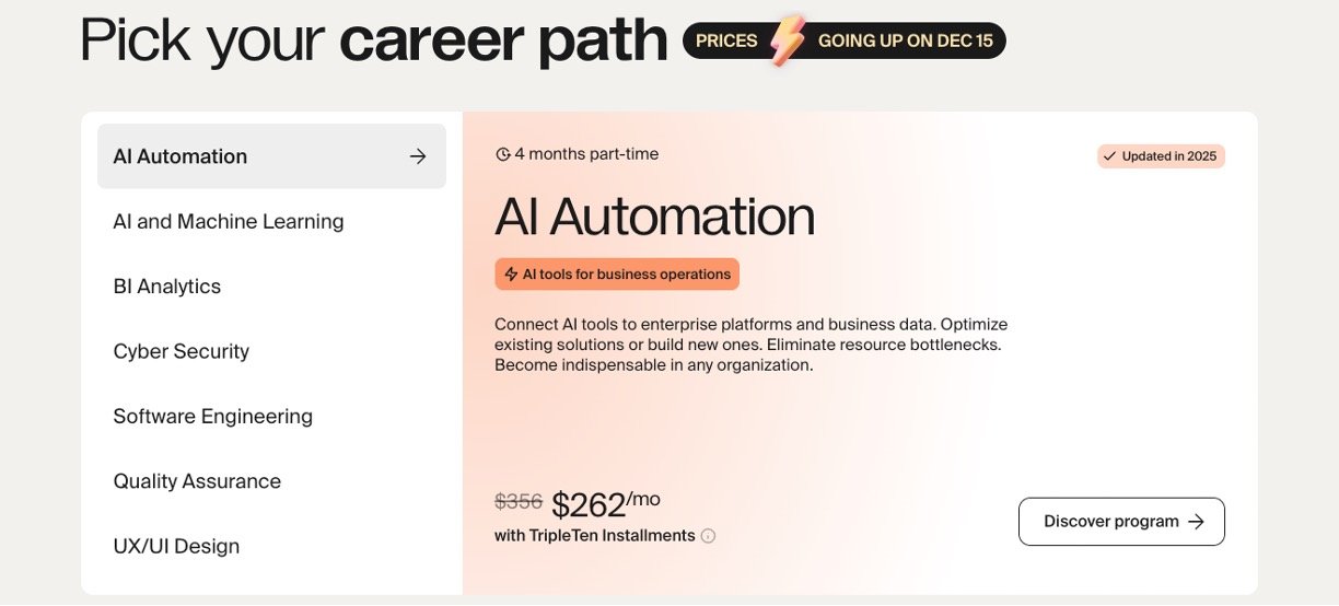 Working pros gaining job-ready skills like prompt engineering and integrations for quick tech role entry.