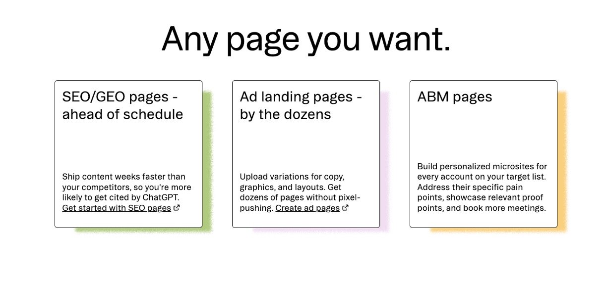 Builds optimized pages in minutes from everyday content like briefs, spreadsheets, or persona lists—no tech hassle.