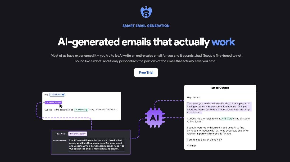 Scout is an all-in-one sales prospecting platform that makes B2B lead hunting simple and fast for anyone. Paste a prospect's LinkedIn profile, tell it about your product, and Scout handles the rest—from finding accurate contact info to crafting personalized emails using public data and smart AI. No more wasting hours on manual research; it cuts your prospecting time in half while boosting lead quality.​