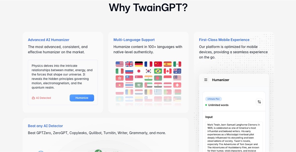 TwainGPT is an advanced AI-powered tool designed to humanize AI-generated text, transforming robotic, machine-written content into natural, engaging, and undetectable human-like writing. It helps writers, marketers, bloggers, students, and professionals produce original, SEO-optimized, and plagiarism-free content that passes all major AI detection systems. TwainGPT ensures that AI-generated drafts are refined with human tone, varied sentence structure, and authentic expression, making the content feel relatable and professional.