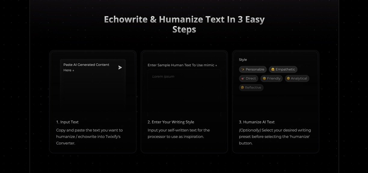 Echowriting magic: Paste your own writing sample, and it mimics your exact style, tone, and quirks for seamless results.