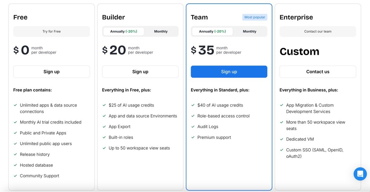 Drag-and-drop builder with 75+ ready components for charts, forms, tables, and more—no CSS or JS required.
