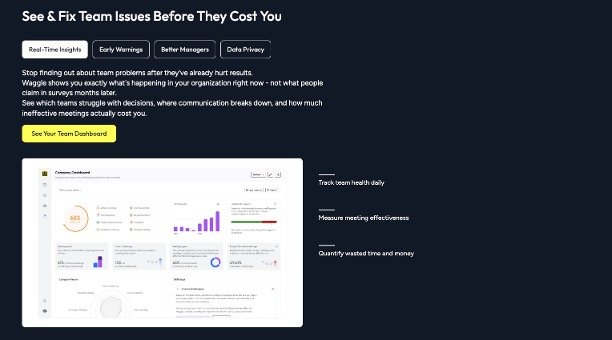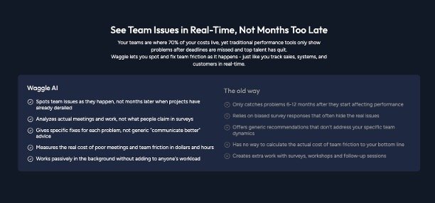 Waggle AI is a smart tool that watches your team's meetings to show leaders exactly what's slowing them down, like poor communication or bad decisions, and gives managers private tips to fix it right away. It works quietly in the background with tools you already use, turning everyday chats into chances to grow without extra work or privacy worries. Teams see big wins, like 32% better meeting agendas and happier people leaving meetings with clear next steps.