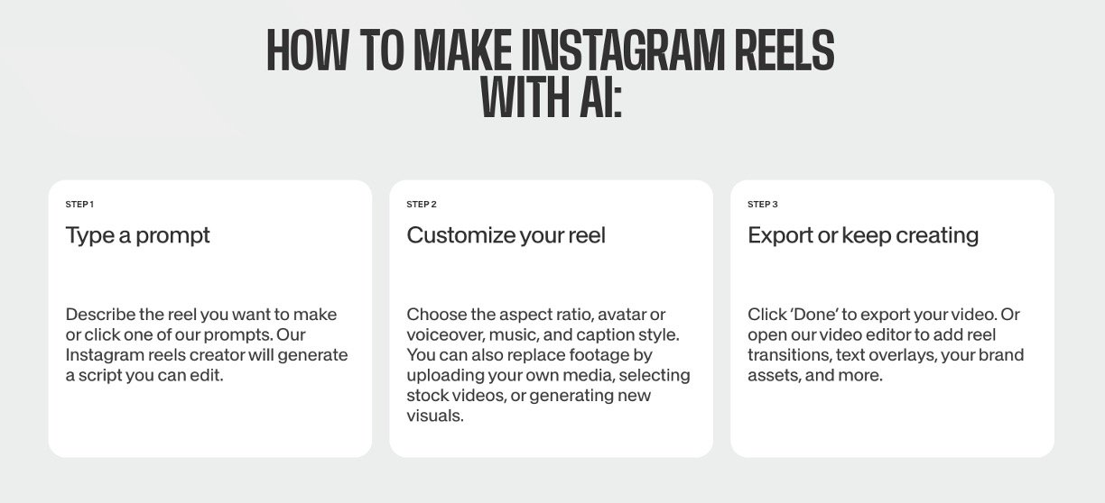 AI generates full reels from text prompts, including scripts, voiceovers, and stock footage.