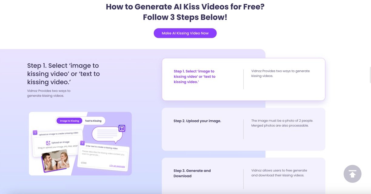 Vidnoz AI Kissing Video Generator is a free online tool that transforms static photos and text into natural, realistic AI-generated kissing videos. Utilizing advanced AI motion consistency models, it identifies facial features and animates them to create smooth and emotionally expressive kissing animations. This platform allows users with minimal technical knowledge to create personalized romantic videos quickly and easily, making it ideal for social media content, gifts, and fun creative projects.