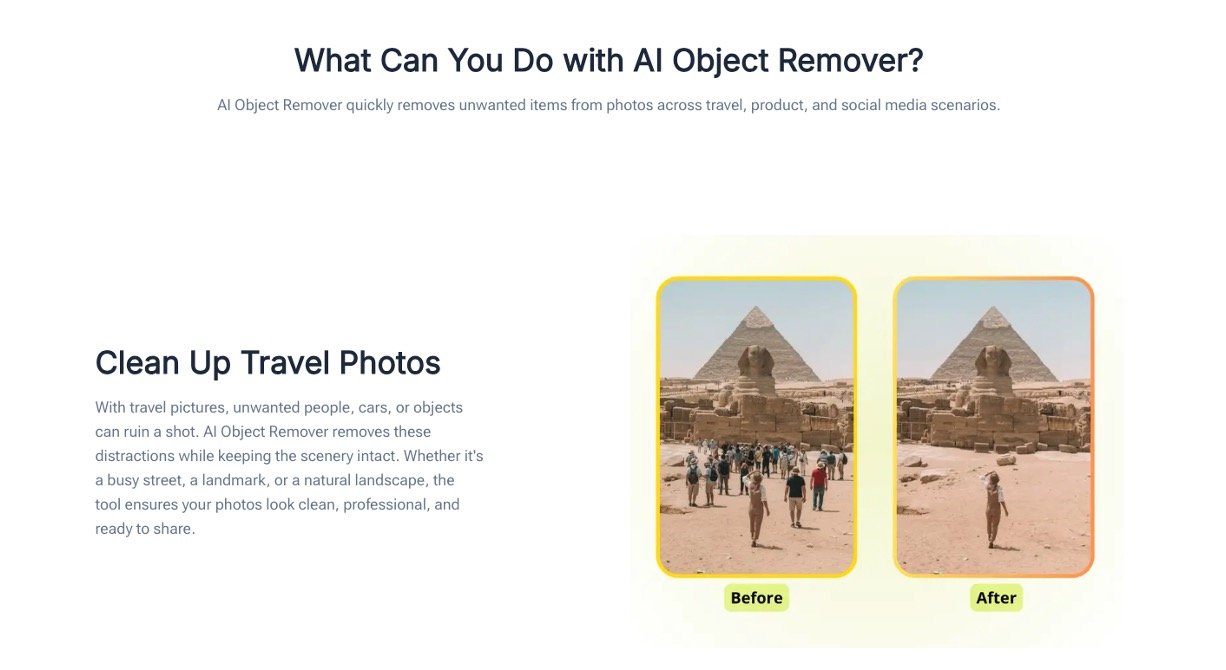 Remove strangers from travel photos to create perfect scenic shots for social media or blogs.