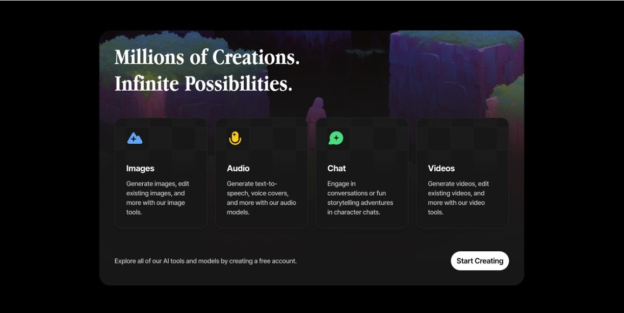 • Easy-to-use cloud platform for creating AI voice covers, generating images, and producing multimedia content.