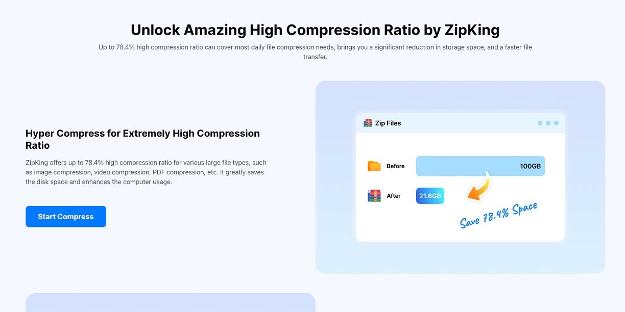 WMaster ZipKing is an AI-powered file compression and extraction tool designed for everyone—from beginners to advanced users. With over 120 million users, ZipKing makes it easy to zip, unzip, and manage all kinds of files, including images, videos, PDFs, and office documents. Its advanced AI algorithms deliver hyper-efficient compression—reducing file sizes by up to 78.4% without losing quality. The platform is secure, ad-free, and supports more than 61 popular file formats, making file management, sharing, and storage effortless for all users.