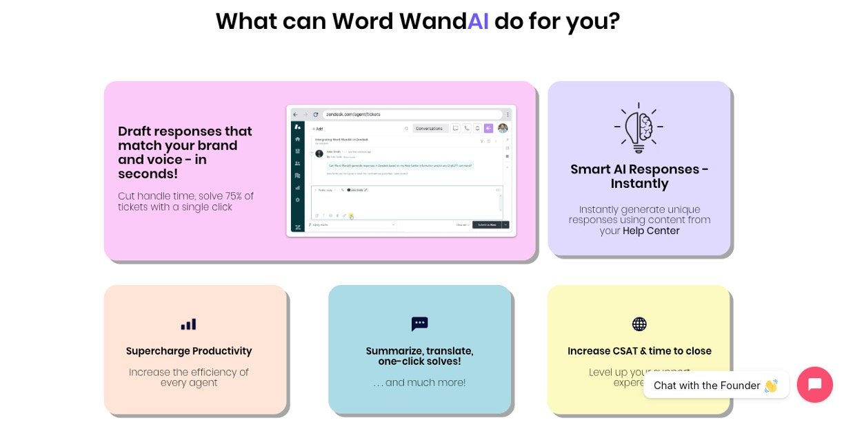 Word Wand AI is an advanced AI-powered assistant specifically designed for Zendesk support agents to boost productivity and enhance customer interactions. It automatically drafts accurate, brand-consistent responses by pulling information from the Zendesk Help Center, saving agents hours of manual typing and searching. The tool integrates seamlessly in Zendesk, offering various AI functions like summarizing tickets, improving grammar, tailoring tone, and translating messages to support multilingual communication. It acts as a smart helper that enables human agents to deliver faster, higher-quality support without replacing them.